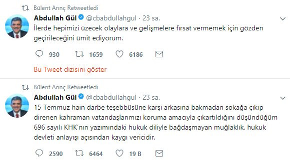 GÜL'ÜN TWİTLERİNİ ARINÇ RT ETTİ: Abdullah Gül'ün bu tweetini takipçileriyle ilk paylaşan isimlerden biri ise, Bülent Arınç oldu. Arınç, Abdullah Gül'e destek olduğunu o twitleri retweet ederek ortaya koydu.