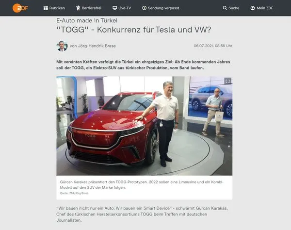 Alman devlet televizyonu ZDF'de, Jörg Hendrik Brase tarafından yerli otomobil TOGG ile ilgili bir yazı yayımladı.