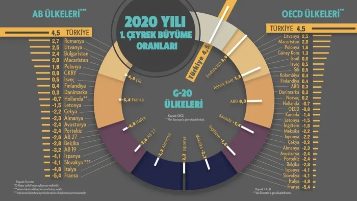 Dünya devlerini geride bırakan Türkiye onca operasyonlara, döviz saldırılarına rağmen dimdik ayakta durarak zirveye yerleşti. Pandemi süreciyle birlikte dünya ekonomilerinin belirsizleştiği bir ortamda; dev ekonomiler olarak nitelendirilen devletlerin ekonomileri küçülürken, ilk çeyrekte Türkiye ekonomisi %4,5'luk büyüme oranıyla G20, AB ve OECD ülkelerini geride bıraktı.Türkiye, Ocak-Şubat-Mart dönemini içeren ilk çeyrekteki büyüme oranıyla; Avrupa Birliği, G20 ve OECD ülkeleri arasında en güçlü büyüme performansı gösteren ülke oldu.