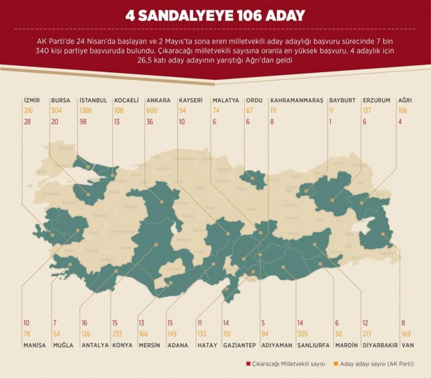 Çıkaracağı milletvekili sayısına oranla en yüksek başvuru, 4 adaylık için 26,5 kat fazla aday adayının müracaat ettiği Ağrı'dan geldi. Ağrı'da 4 milletvekilliği için 106 kişi aday adaylığı başvurusu yaptı. Adıyaman'da ise 5 milletvekilliği için 94 aday adaylığı başvurusu yapıldı.
