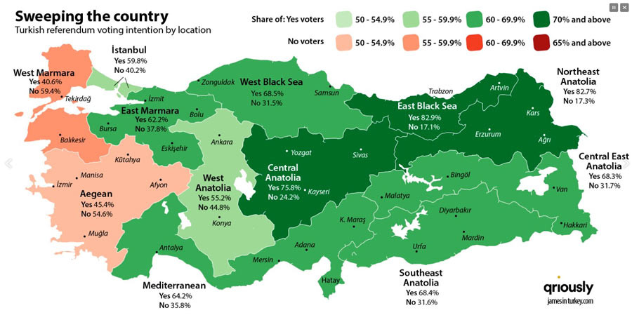 Referandum sonuçlarına göre çıkarılan 'evet-hayır' haritasında, 'Evet' oylarının Karadeniz ve İç Anadolu Bölgesi'nde yoğunlaştığı görülüyor. 'Hayır' oyları ise, Ege Bölgesi'nde yoğunlaştı.