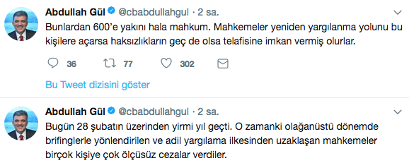 “Bugün 28 şubatın üzerinden yirmi yıl geçti. O zamanki olağanüstü dönemde brifinglerle yönlendirilen ve adil yargılama ilkesinden uzaklaşan mahkemeler birçok kişiye çok ölçüsüz cezalar verdiler” diyerek dönemin yargılamalarını eleştiren Gül, “Bunlardan 600’e yakını hala mahkum. Mahkemeler yeniden yargılanma yolunu bu kişilere açarsa haksızlıkların geç de olsa telafisine imkan vermiş olurlar” ifadelerini kullandı.