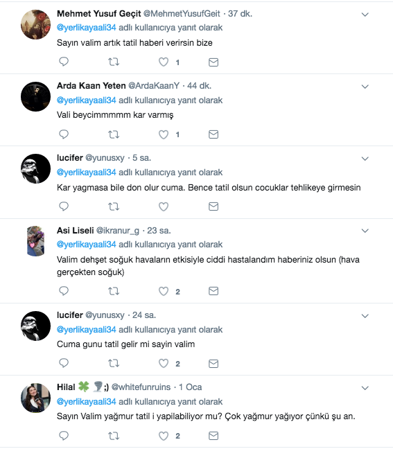 İSTANBUL'DA ÖĞRENCİLERDEN VALİYE MESAJ YAĞMURU... Çanakkale'den gelen kar tatili haberi üzerine bu geceden itibaren yoğun kar yağışı ve kar fırtınası uyarısı yapılan İstanbul'da okulların tatil edilip edilmeyeceği merak konusu oldu. Öğrenciler İstanbul Valisi Ali Yerlikaya'yı sosyal medya üzerinden okulları tatil etmesi için mesaj yağmuruna tutmaya başladı. İşte o mesajlardan bazıları...