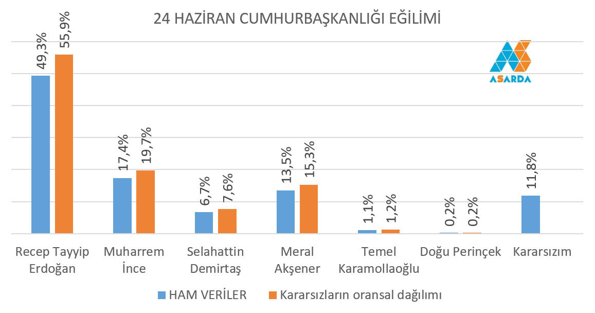 CUMHURBAŞKANLIĞI SEÇİMİ... Anket sonuçlarına göre cumhurbaşkanlığı seçimine girecek adayların oy oranları da şöyle gözüküyor. Cumhurbaşkanı Recep Tayyip Erdoğan yüzde 55.9 ile ilk turda ipi göğüsleyecek görünüyor. Muharrem İnce yüzde 19.7, Meral Akşener yüzde 15.3, Selahattin Demirtaş yüzde 7.6 bandında gözüküyor.